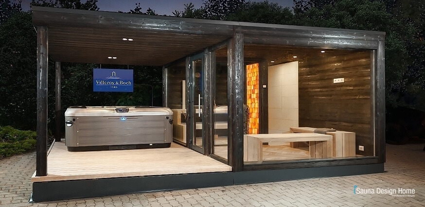 Vordachkonstruktion, wobei das modulare Jetpack-System von Villeroy & Boch das Erlebnis einer individuellen Heilmassage garantiert, dessen stabile Grundlage durch einen extra breiten Boden aus Massivholz, Stärke 4,4cm, Thermowood Erle, Klasse 1 gesichert wird.