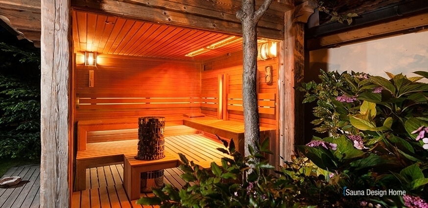 Dies wird durch das Spiel der horizontalen Wandverkleidung aus kanadischen roten Zedern der Kategorie A+, der Gestaltung des Bodens in einem pendelnden Stil, der wärmeisolierten und großzügigen Panorama-Verglasung und der versteckten LED-Beleuchtung gesichert. Auch an das Feeling denkend wurde eine Bewässerung für den Außenbereich an die Seitenwand der Sauna gebaut, die sich nur ahndevoll unter den Blättern des Baums sehen lässt.
