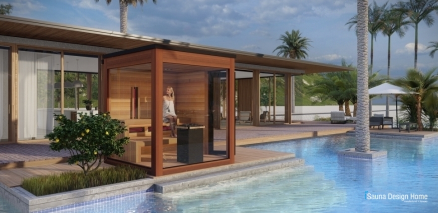 Zum Beispiel eine der neuesten Außensaunen, in denen sich die finnische Sauna, Infrarotsauna und Dampfsauna befinden.