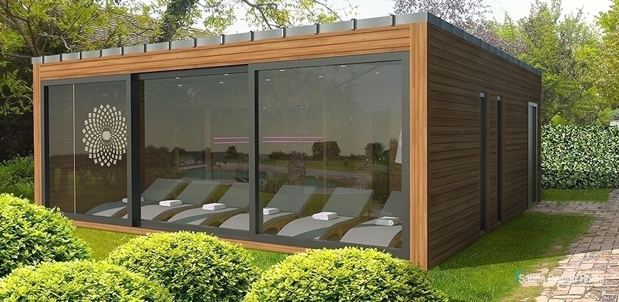 Bei diesem Projekt wurde ein 58 m² großes, maßgefertigtes Outdoor-Wellness-Saunahaus gebaut.